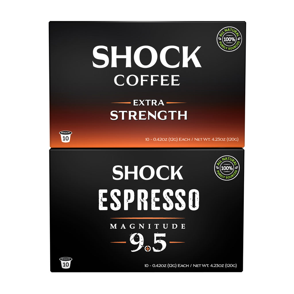 [Shock Coffee]: Pioneering bold, high-caffeine coffee blends for more than 28 years, Shock Coffee delivers a premium, ethically sourced brew that energizes your day with intense flavor and smooth quality.