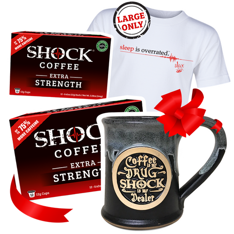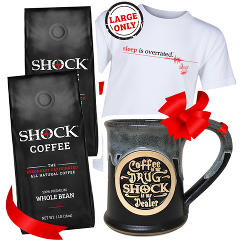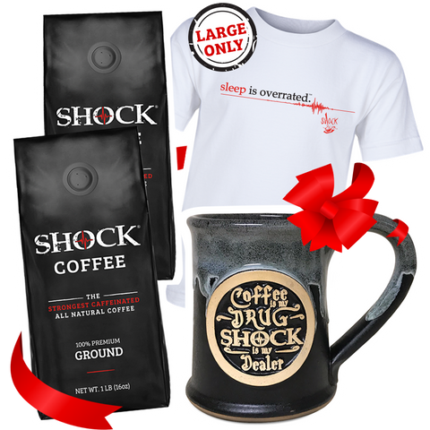 $57.99Shockaholics will LOVE the ultimate buzz gift bundle. 2 lbs of our signature Shock brew plus our limited edition 14 oz ceramic mug and vintage 'sleep is overrated' tee will surely make any caffeine addict happy! Products included: 2LB GROUND 14...